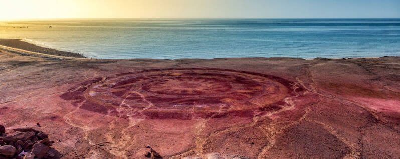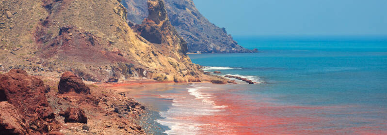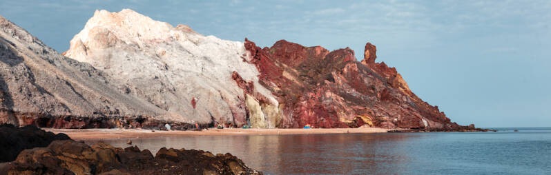 I'm in a cafe, a trendy coffee shop with real cappuccino, espresso and fresh herbal drinks. Hipsters with beards, hippies in flowery dresses, youngsters with guitars on the back and outdoor types. All not that odd, but the location of the place is. I'm on the Iranian island of Hormuz, located in the blistering heat of the Persian Gulf.